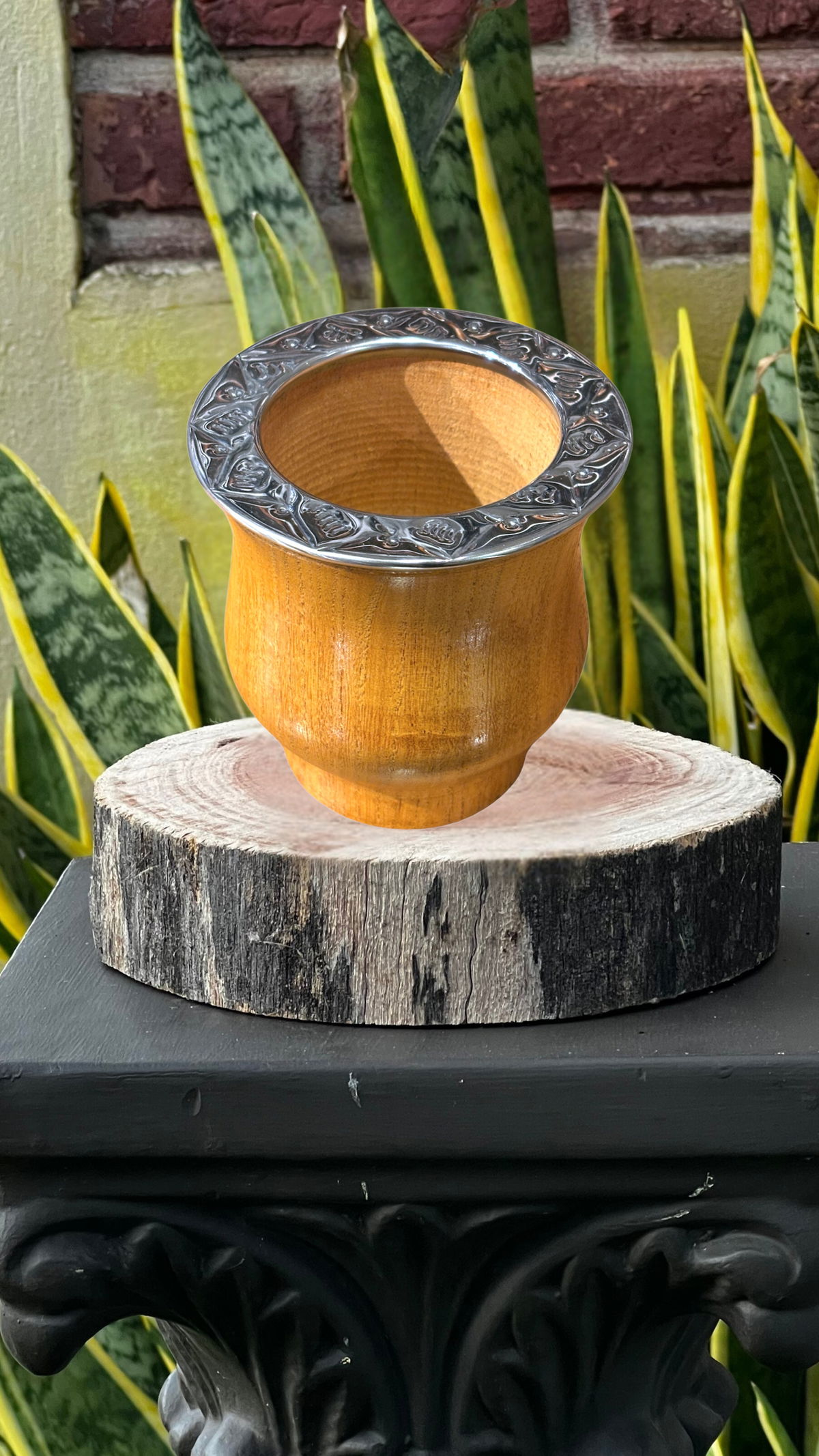 Exterior: Hecho en madera de Algarrobo macizo, pulido para un agarre suave y natural.